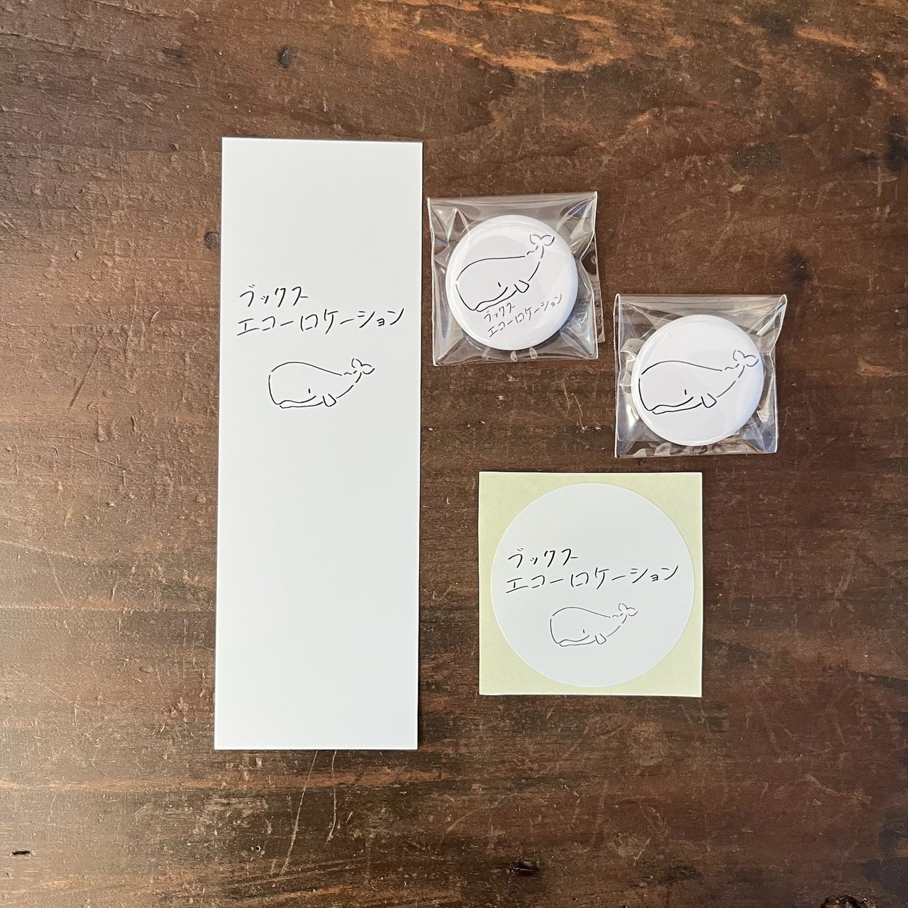 ブックスエコーロケーションのロゴが入ったしおり、缶バッジ、ステッカーのセットです。